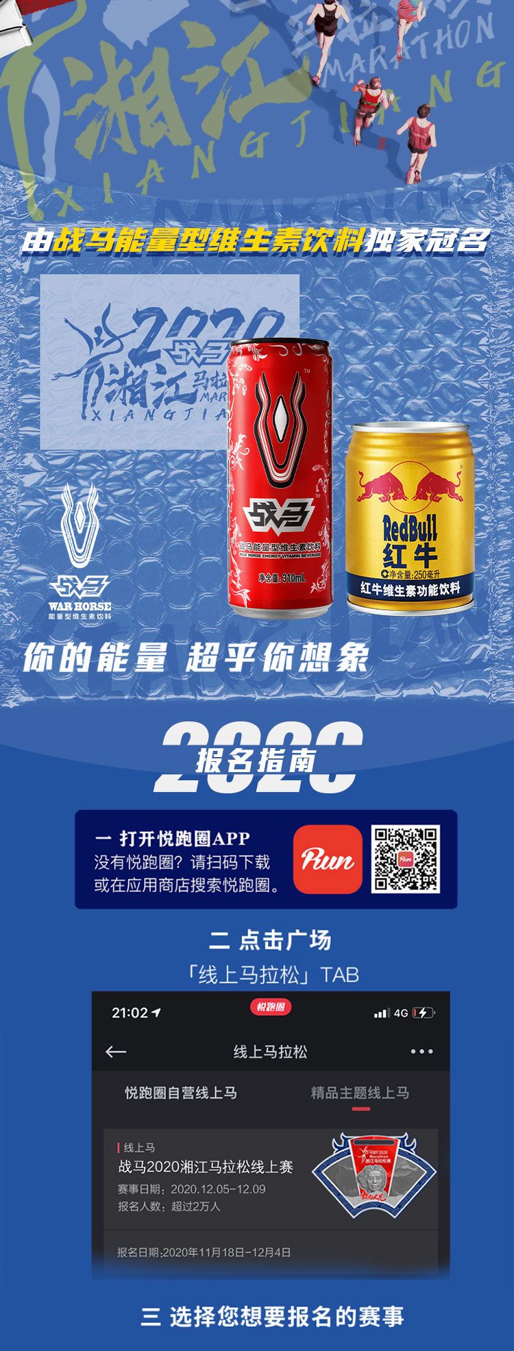? 報名途徑:選手們需登錄線上跑官方指定跑步類APP—“悅跑圈”-點擊「廣場」-「線上馬拉松」入口,選擇戰馬2020湘江馬拉松線上賽